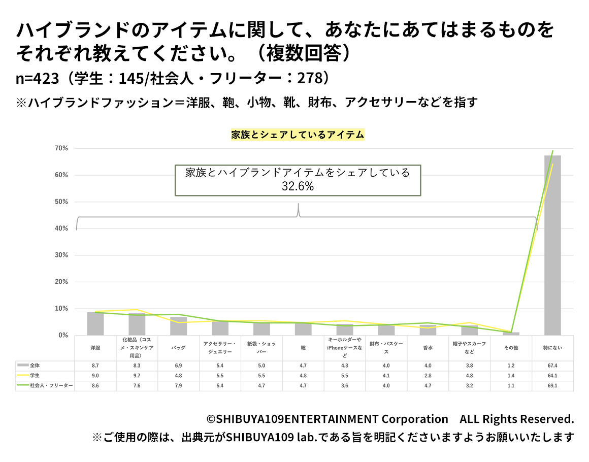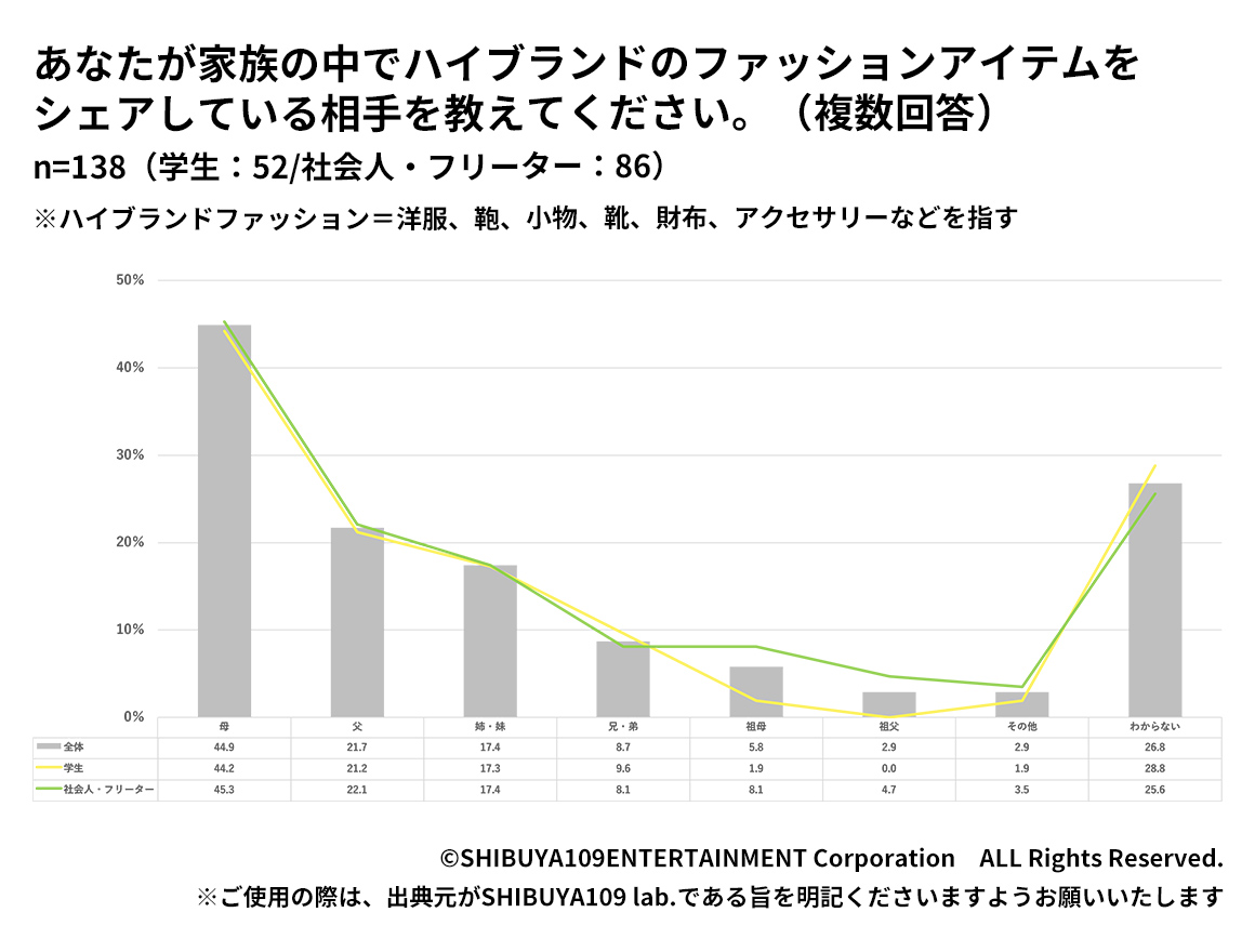 また、家族とハイブランドアイテムをシェアしているのは全体の32.6%で、シェア相手として最も多かったのは「母(44.9%)」でした。