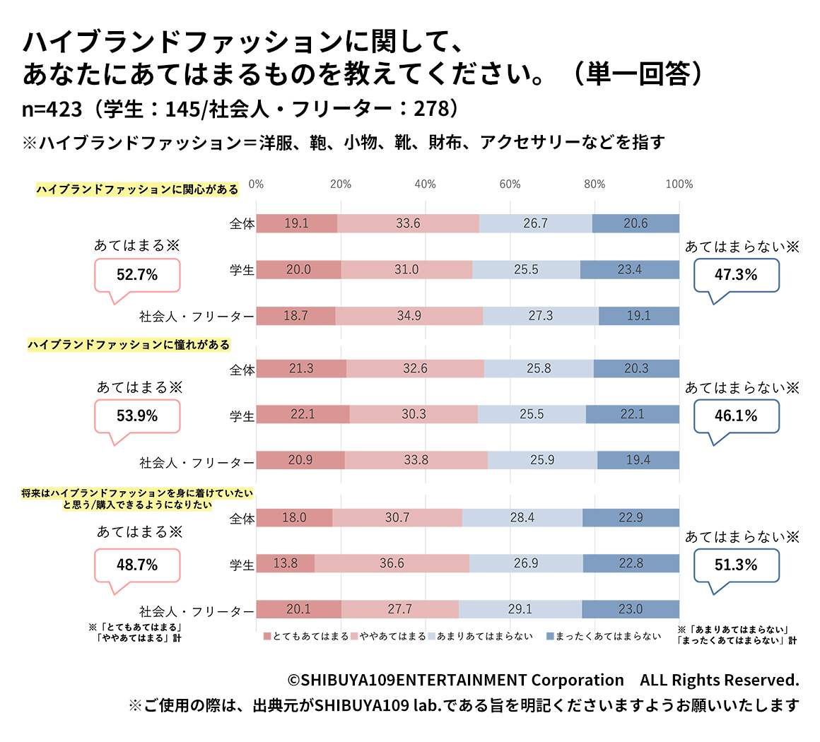 最後にハイブランドのイメージや関心について聞いてみました。まず、「ハイブランドファッションに関心がある」と回答したのは52.7%、「ハイブランドファッションに憧れがある」と回答したのは53.9%、「将来はハイブランドファッションを身に着けていたいと思う/購入できるようになりたい」と回答したのは48.7%で、ハイブランドファッションは誰もが憧れるものではなくなっており、ハイブランドに関する考え方が多様になっていることがわかります。