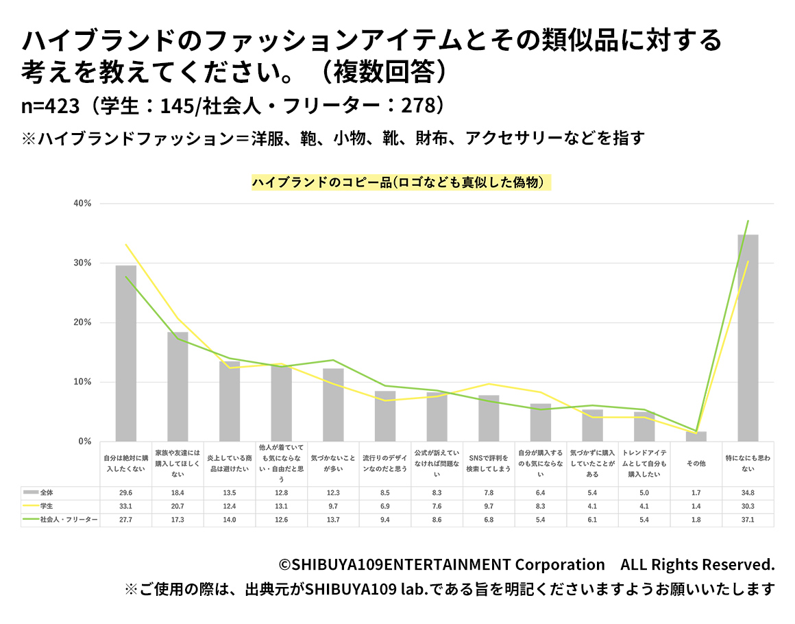 最後にコピー品や模倣品について、購入したことがあるのは25.1%となりました。コピー品に関しては「絶対に購入したくない(29.6%)」「家族や友達には購入してほしくない(18.4%)」「炎上している商品は避けたい(13.5%)」などの声が聞かれました。グループインタビューでも、「自分は手を出さない。友達に見せた時に、偽物だとバレたら恥ずかしい」「他人が着ていても何も思わないが、コピーと知っていて着ているのを見ると、そんなに無理しなくても良いのにと思う」などの声が聞かれました。