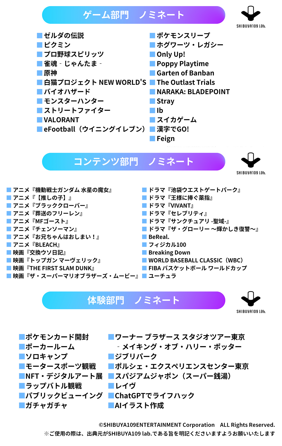 ノミネート一覧については、SHIBUYA109 lab.独自ネットワーク「SHIBUYA109 lab. MATE」に所属する10名の高校生・大学生と選定しております。