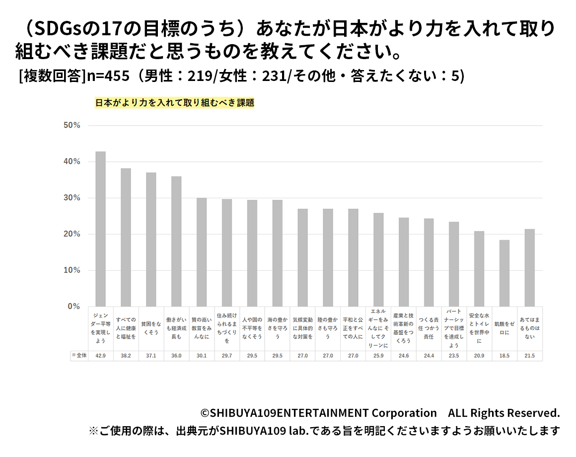 一般にZ世代はジェンダーに関する課題への関心が高いとされていますが、2020年にSHIBUYA109 lab.がZ世代を対象に実施したSDGsに関する調査において、SDGsにおける17の目標のうち、日本がより力を入れて取り組むべきだと思う目標は「ジェンダー平等を実現しよう」が第1位となっています。