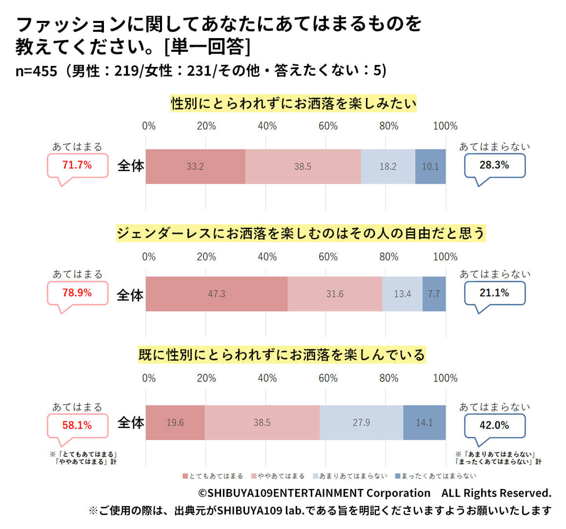 ジェンダーとファッションに関して「性別にとらわれずにお洒落を楽しみたい」と回答したのは71.7%、「ジェンダーレスにお洒落を楽しむのはその人の自由だと思う」という回答が78.9%、「すでに性別にとらわれずにお洒落を楽しんでいる」という回答が58.1%になりました。