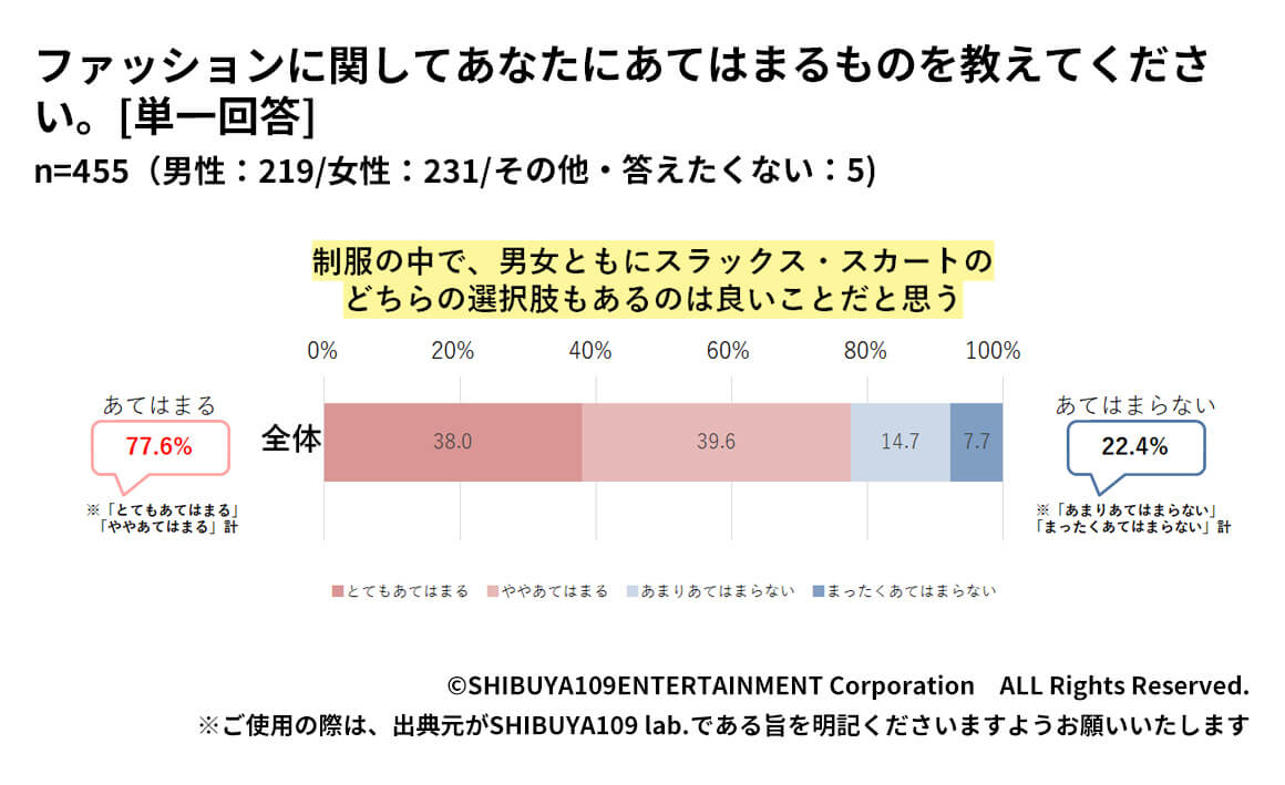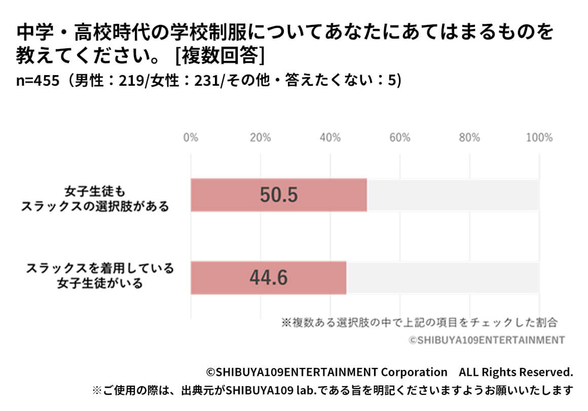 学校制服に関して、「制服の中で、男女ともにスラックス・スカートどちらの選択肢もあるのは良いことだと思う」と回答したのは77.6%となり、実情を調査した質問でも学生生活において、「女子生徒もスラックスの選択肢がある」のは50.5%、「スラックスを着用している女子生徒がいる」のは44.6%となりました。