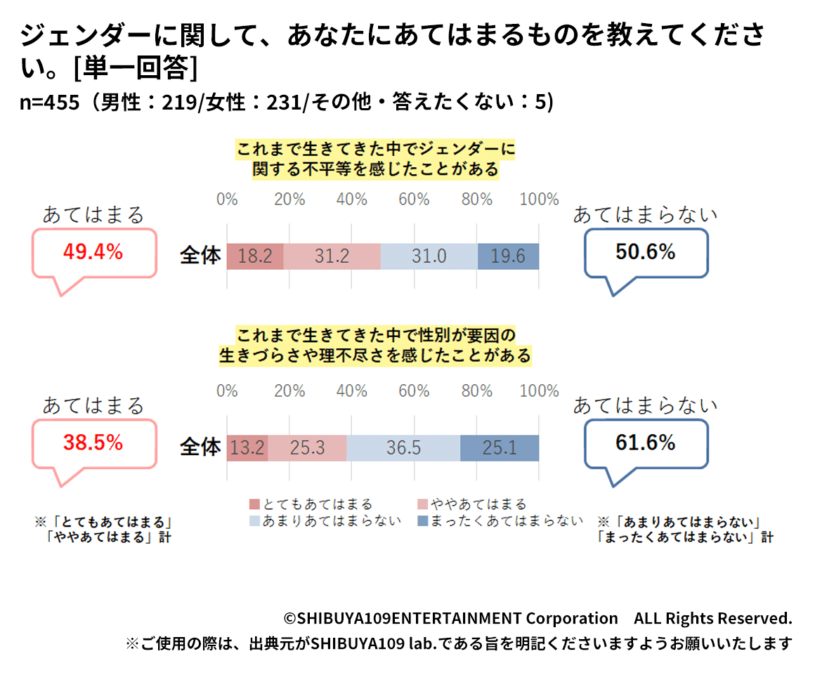 「これまで生きてきた中でジェンダーに関する不平等を感じたことがある」には49.4%が、「これまで生きてきた中で性別が要因の生きづらさや理不尽さを感じたことがある」という設問には38.5%の方が「とてもあてはまる」「ややあてはまる」を選択しました。