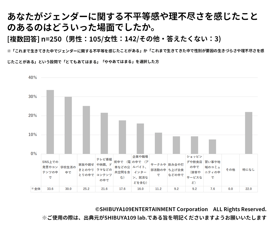 さらに、上記の設問に対し「とてもあてはまる」「ややあてはまる」を選択した対象者から、ジェンダーに関する不平等感や理不尽さを感じる場面について聞いてみると、「SNS上での発言やコンテンツの中で」が33.6%、「学校生活の中で」が30.0%、「家族や親せきとのやりとりの中で」が25.2%で多くなっています。グループインタビューでは、「共働きなのに母親の方が家事の負荷が高いのをみて、自分の家庭内で違和感を感じた」「飲食店で量が少なめのものを頼もうとすると『レディースセット』といった名前になっていて、(自分が男性なので)頼みづらい」などの実体験が話題に上りました。