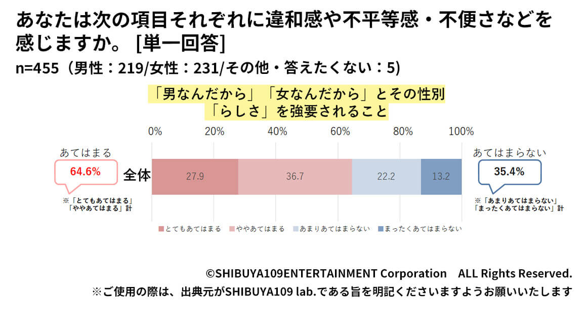また、「『男なんだから』 『女なんだから』という性別『らしさ』を強要されること」に違和感・不平等感を感じるのは64.6%となっています。グループインタビューでは、「学校にも性的マイノリティであることをカミングアウトしている人がいて身近な存在である」「男女平等を社会全体で掲げていて、そういうのを理解しないといけない風潮があって、皆も理解しようとしていると感じる。考え方がどんどん変わってきているんだなと思う」といった声が聞かれました。
