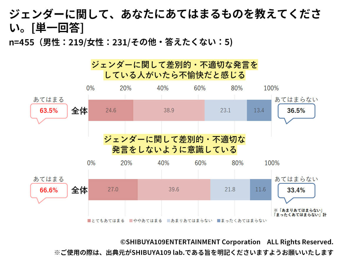 また、「ジェンダーに関して差別的・不適切な発言をしている人がいたら不愉快だと感じる」と回答したのは、63.5%となりました。また、「ジェンダーに関して差別的・不適切な発言をしないように意識している」のは66.6%になりました。