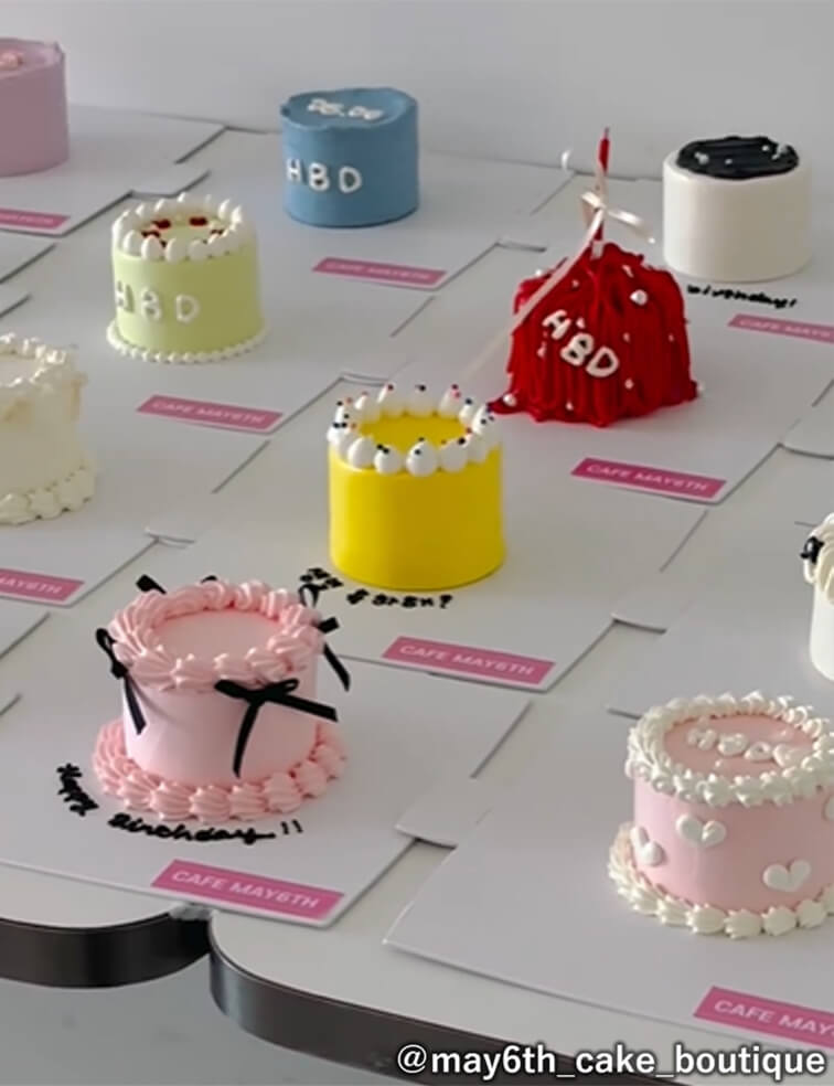 手のひらサイズの小さいケーキ。デザイン性の高い小さなケーキであることから、一度に複数個並べたビジュアルの可愛いさが魅力です。