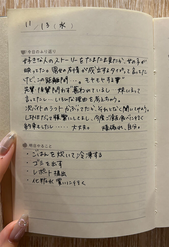 日記を書く界隈のこと。自分が書いた手書きの日記をTiktokに投稿する人も増加しており、ダイゴー社から発売されている「夜とカフェオレと日記帳」というノートがTiktokで人気です。