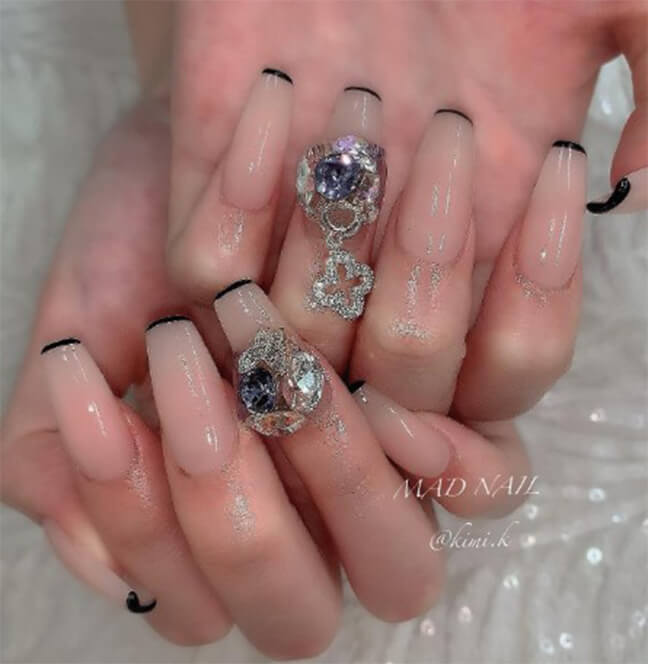 爪からパーツが垂れているデザインのネイル。パーツが固定されていないため、バッグにチャームを付けているような、揺れる動きのあるデザインの斬新さに注目が集まっています。