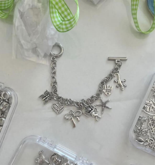 好きなパーツをセレクトし、好みのブレスレット作りを楽しめるハンドメイド体験のこと。専門ショップもあり、友達と気軽に体験できるとして注目されています。チェーンにパーツが沢山ついているアクセサリーが人気。