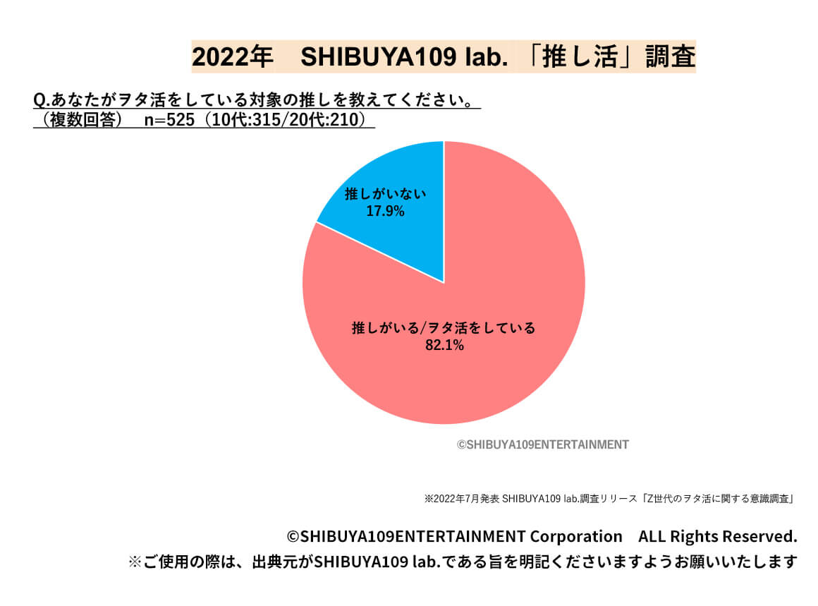 2021年には「現代用語の基礎知識選 2021ユーキャン新語・流行語大賞」にもノミネートもされた「推し活」。2022年のSHIBUYA109 lab.の調査でも、8割以上の若者(=around20)に「推しがいる」ことがわかりました。
