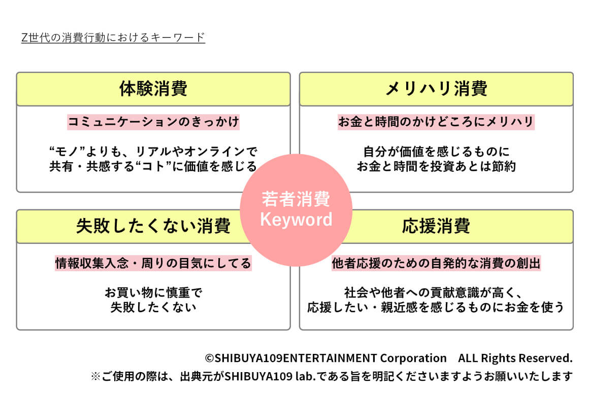 SHIBUYA109 lab.では2018年から若者の消費行動を整理し、4つのKeywordにまとめてきましたが、そのKeywordにも大きく「推し活」が関わります。「推し」を含む他者を応援したい気持ちが生む「応援消費」、普段は節制し「推し活」など自分が価値を感じるものだけにお金と時間を投資する「メリハリ消費」が最もわかりやすいでしょう。