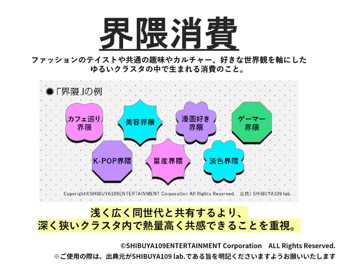 さらに、2022年からSHIBUYA109 lab.が提唱している「界隈消費」では、「推し」を軸にしたクラスタも多く、推している対象ごとに文化の異なる小さな消費圏が次々生まれています。