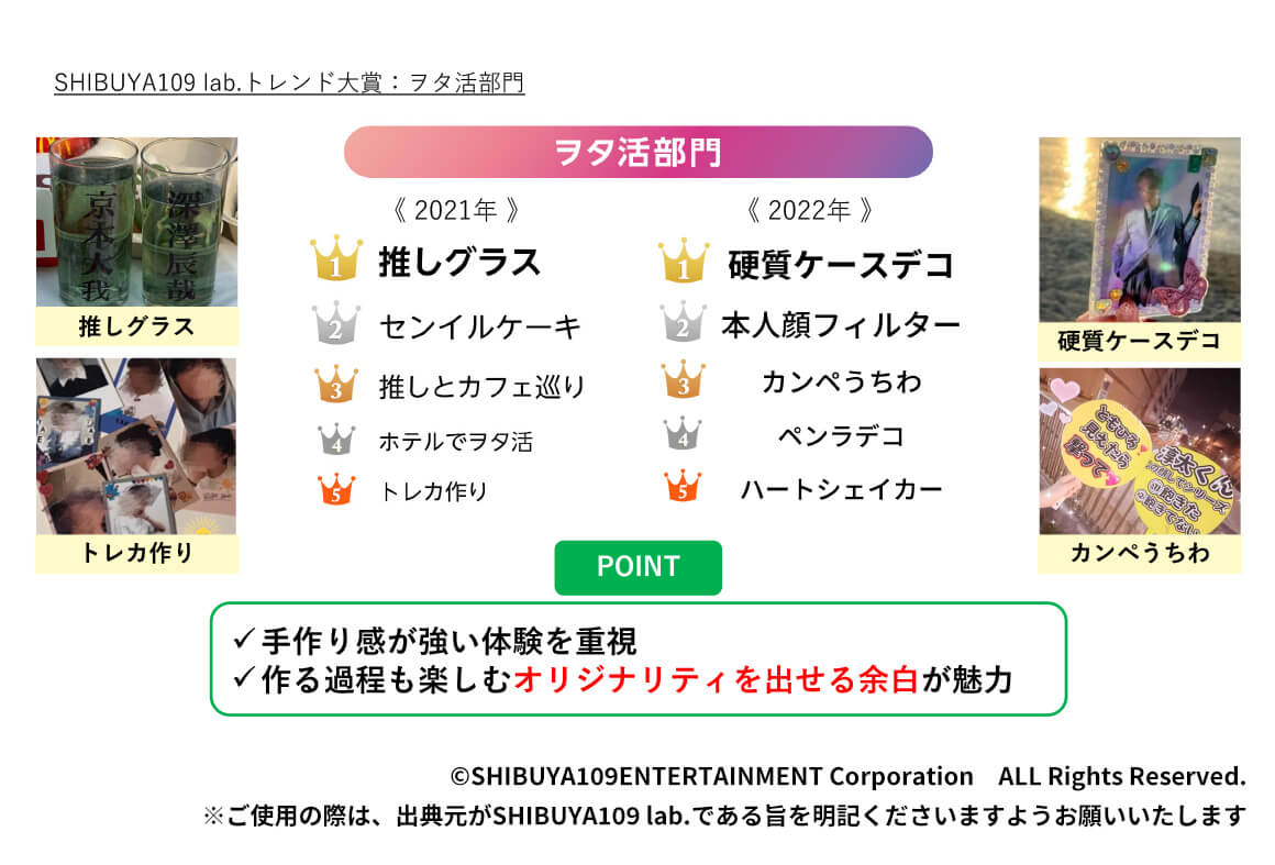 推し活における創作が盛り上がり始めたきっかけはコロナ禍にありました。ライブ参加などの推し活が制限される中、自分の推しを表現するアイテムを自作する流れが生まれ、2021年・2022年のSHIBUYA109 lab.トレンド大賞のヲタ活部門では『推しグラス(2021年1位)』『センイルケーキ(2022年 第二位)』『硬質ケースデコ(2022年1位)』『カンペうちわ(2022年2位)』『ペンラデコ(2022年3位)』がランクインしました。