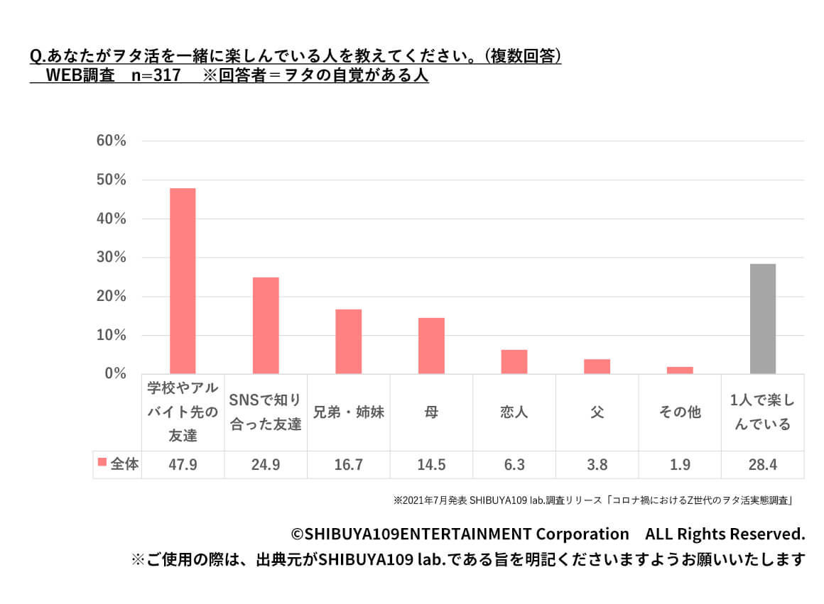 ゾーニングされた「界隈」の中では、推しに関する情報収集や発信された動画などを見ている他、ヲタ友をつくることも積極的に行われています。2021年の調査では、推し活を一緒に楽しんでいる人として「SNSで知り合った友達」が約25%となり学校やアルバイト先の友達に次いで二番目に多くなりました。