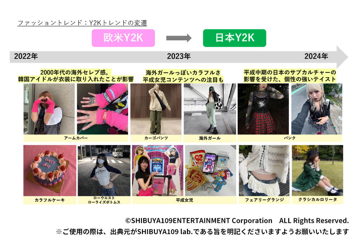 2022年には海外セレブを中心とした、欧米の2000年代初期を表現するファッションが流行していたのに対し、2023年は2000年代初期の日本でトレンドとなった原宿文化や、平成女児(平成初期の女児)が楽しんだ玩具やゲーム、ブランドを取り入れたファッションが流行、2024年はさらに、2000年代初期の日本のサブカルチャーの影響を受けた個性の強いファッションが人気になっています。