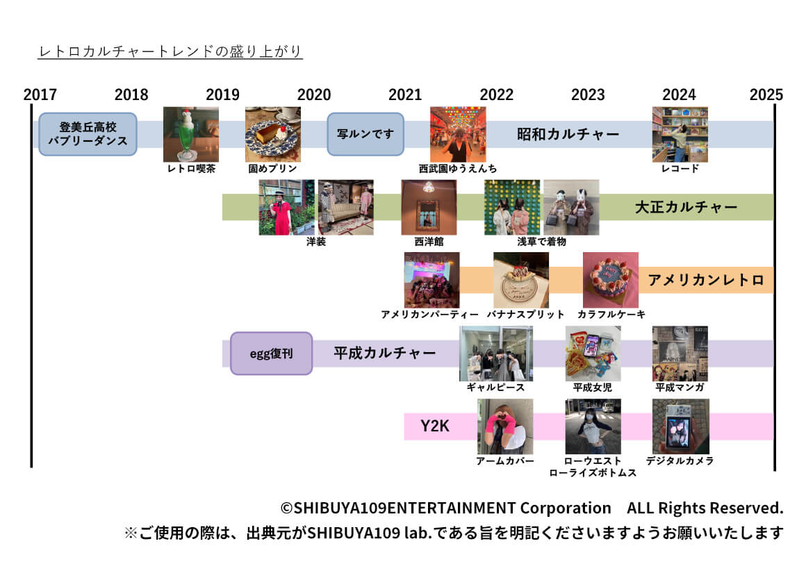 2022年にはSHIBUYA109lab. トレンド大賞2022で『Y2K(2000年代初期のファッションやカルチャー)』が7位にランクインし、以降2024年現在も楽しまれていますが、2019年フード部門に『レトロ喫茶』、2022年に『バナナスプリット』や『町中華/ガチ中華』、2021年体験部門に『西武園ゆうえんち』がそれぞれノミネート入りしていることから、Y2Kブーム以前から昭和・大正のカルチャーにまつわる体験が楽しまれていたことがわかります。