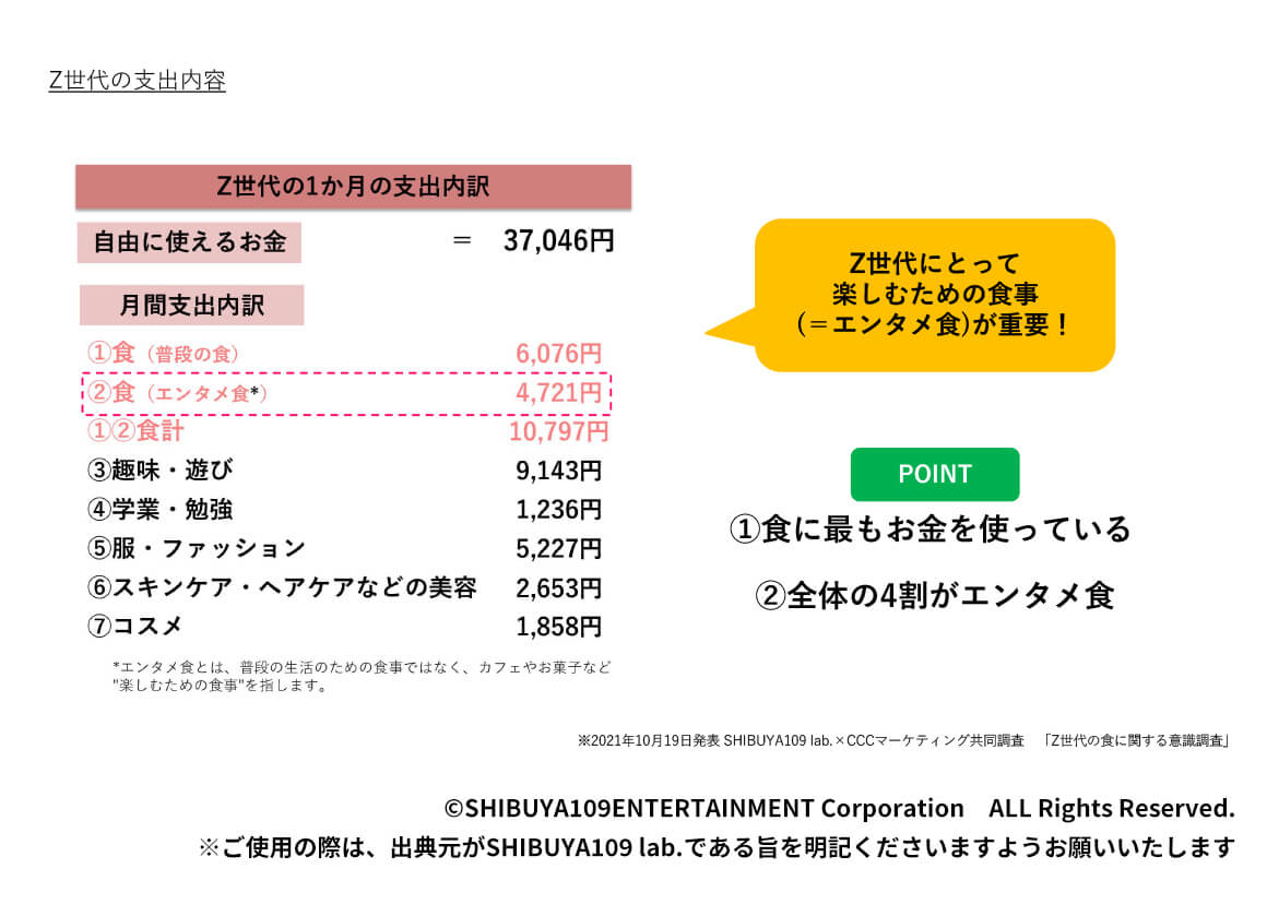 SHIBUYA109 lab. が2022年に行った調査にてaround20が「お金をかけていること」について調査した際、「食べ歩き」が第一位になりました。2021年の調査でも、1,184人に聞いた支出の内訳の中で、最もお金を使っているのが「食」となり、37,046円の可処分所得のうち、10,797円を食に使うなど、全体の1/4以上を食に使うことが明らかになっており、若者にとって、飲食することは、日常の楽しみの大きな一つになっているのがわかります。その消費意欲にともない、トレンドも新しいメニューも次々生まれています。