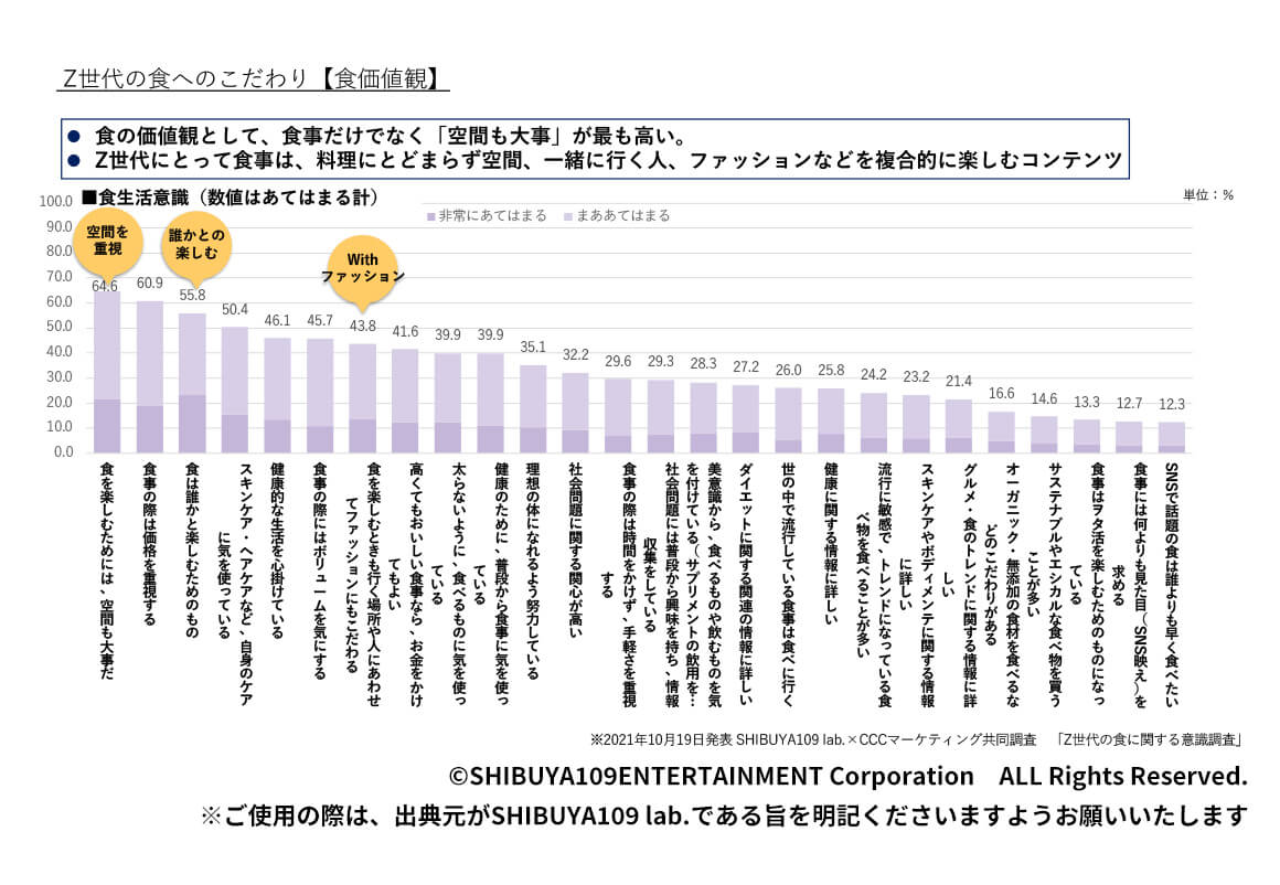 2021年に行った、食に関する価値観に関する調査でも、大事にしている価値観として「食を楽しむためには、空間も大切だ」「食は誰かと楽しむためのもの」などが上位に入り、食が誰かと共有する体験として楽しまれていることがわかります。