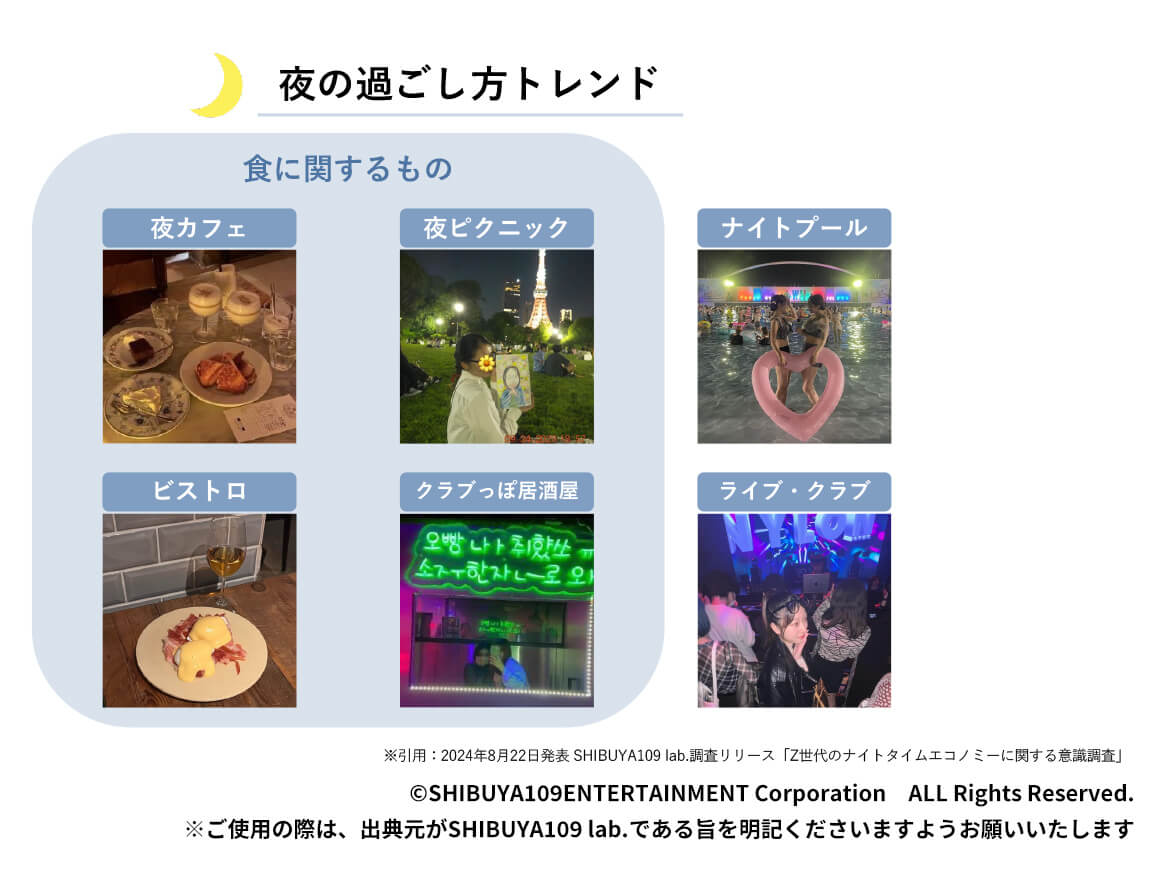 2023年頃から気になる変化が見られるのが、「ナイトアクティビティ×食」の領域です。食に限らず若者の中で、ナイトアクティビティの盛り上がりが見られており、2023年トレンド大賞には、「夜カフェ」「ネオンカフェ」「ナイトプール」がランクイン。2024年トレンド予測にも「夜カフェ&バー」「クラブっぽ居酒屋」が登場しました。カフェやバーなど、食体験にも大きな影響がありそうです。