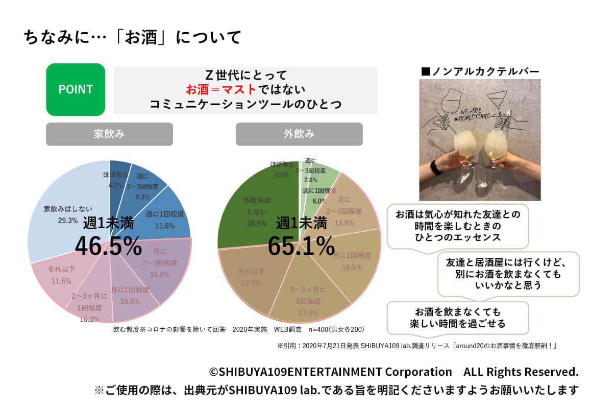 さらに、夜×食事といえば、お酒をイメージする人も多いかもしれませんが、夜の時間帯のお出かけでお酒を飲まないことがあると回答した若者は63.3%、お酒を飲むのが好きだと回答したのは半数以下となり、お酒は必要なものではなくなっていることがわかります。飲み会の頻度も週に1度未満と、習慣化されていないこともわかりました。