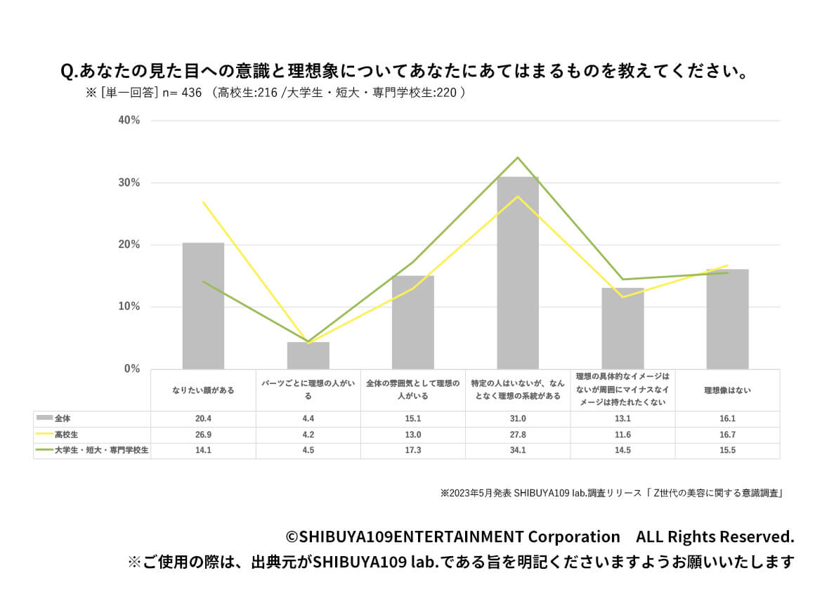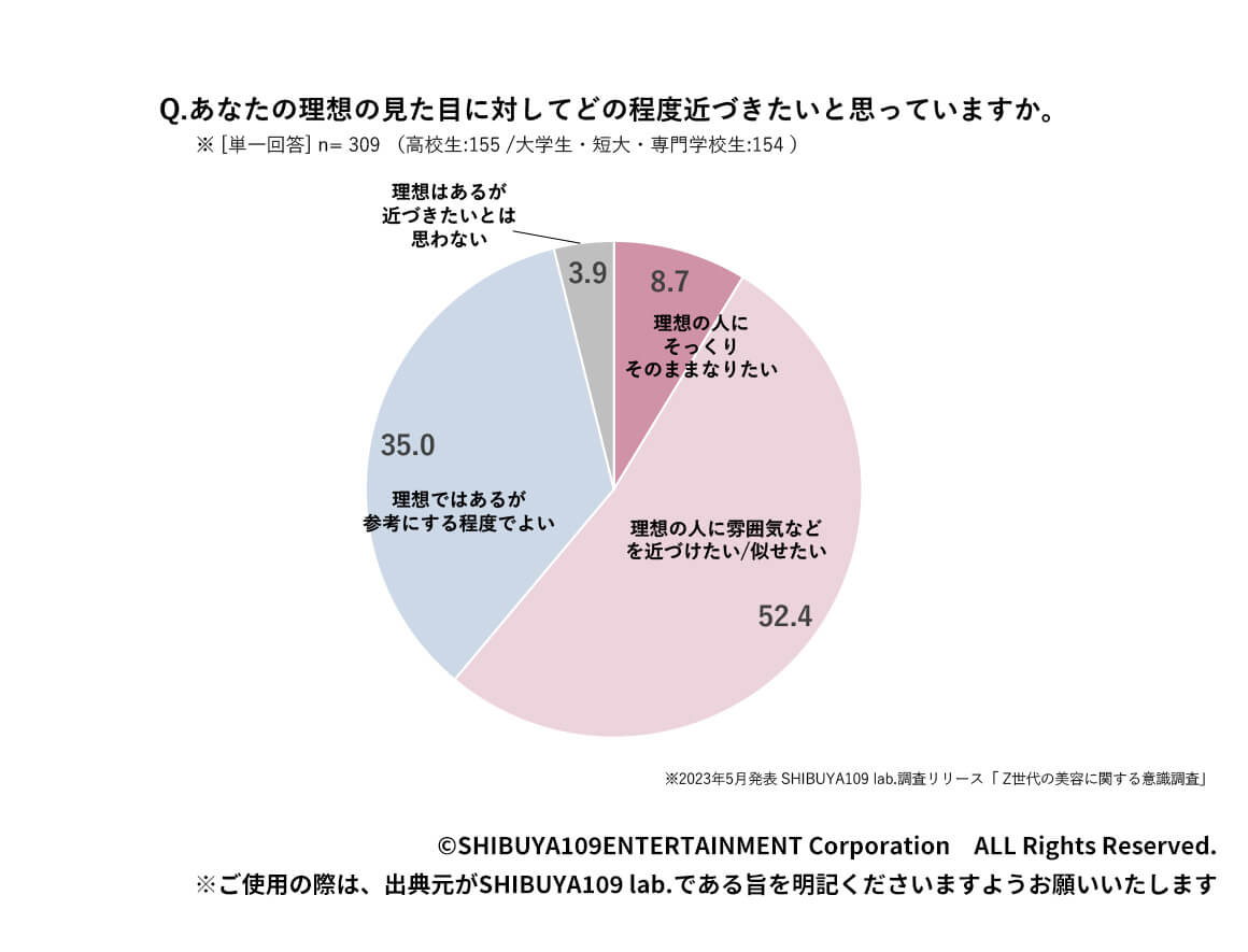 2023年の調査でも、理想とする美について、「(理想像として)特定の人はいないが、なんとなく理想の系統がある」「理想の人に雰囲気などを近づけたい」という回答が最も多くなるなど、自分の理想の姿を実現することにおいて、雰囲気・世界観が重視されているのが見て取れます。