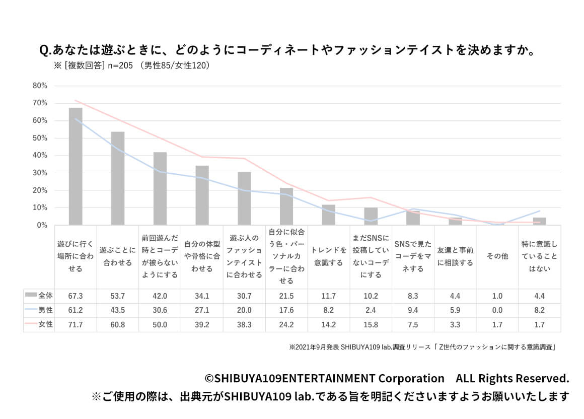 グループインタビューでは、「相手の服装に合わせることが多い。女子がいるときに全部モード系で決めると引かれそうなのでシンプルめのコーデにする。逆におしゃれな男友達と買い物に行くときは自分の中でもお気に入りの攻めたコーデをする。(男子大学生)」、「友達と遊ぶ場所が決まったら、事前にどんなコーデにするか相談する。例えば、カフェだから淡色コーデ(ベージュなど淡い色でまとめたコーデ)にしようみたいな感じ。似たコーデの方が仲良く見えるし、写真を撮った時も場所とコーデが合うと統一感が出て良い。(女子大学生)」といった声が聞かれました。