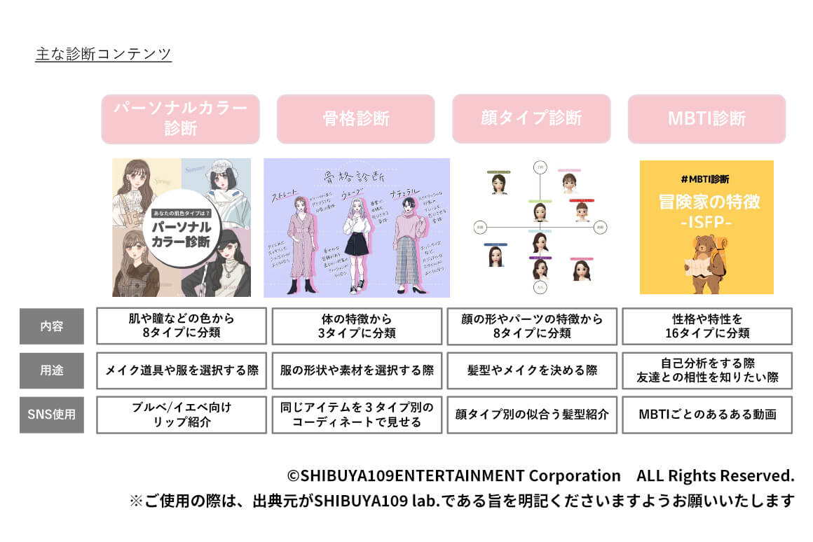 SHIBUYA109 lab.トレンド大賞でも、2021年の予測には「骨格診断」がノミネートし、2022年体験部門にも「MBTI診断」「顔タイプ診断」がランクイン。その他に「パーソナルカラー診断」なども人気で、今やファッションやコスメを語るうえで、「イエベ/ブルベ」「骨格ストレート/骨格ウェーブ/骨格ナチュラル」などといった診断結果のワードは欠かせなくなっています。個人だけではなく、ファッション・コスメメーカーも使用するほど当たり前になっているのです。