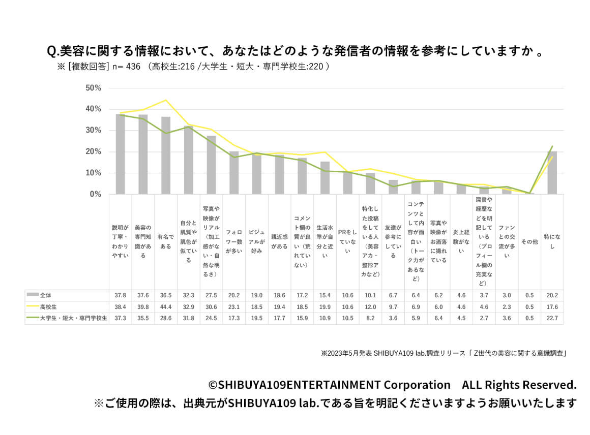 診断だけではなく、“自分に近い属性を探り当て、情報収集を行う” という意識は強く、インフルエンサーの投稿を見る際の意識にも影響を与えています。2022年のグループインタビューでは、「よく見るインフルエンサーは自分と年齢が近いので同じような肌悩みも多く(中略)信頼している。(女子大生)」という声が聞かれたり、2023年の調査では、美容に関する情報を参考にする基準として「自分と肌質や肌色が似ている」という点が32.3%で上位に挙がったりしていました。