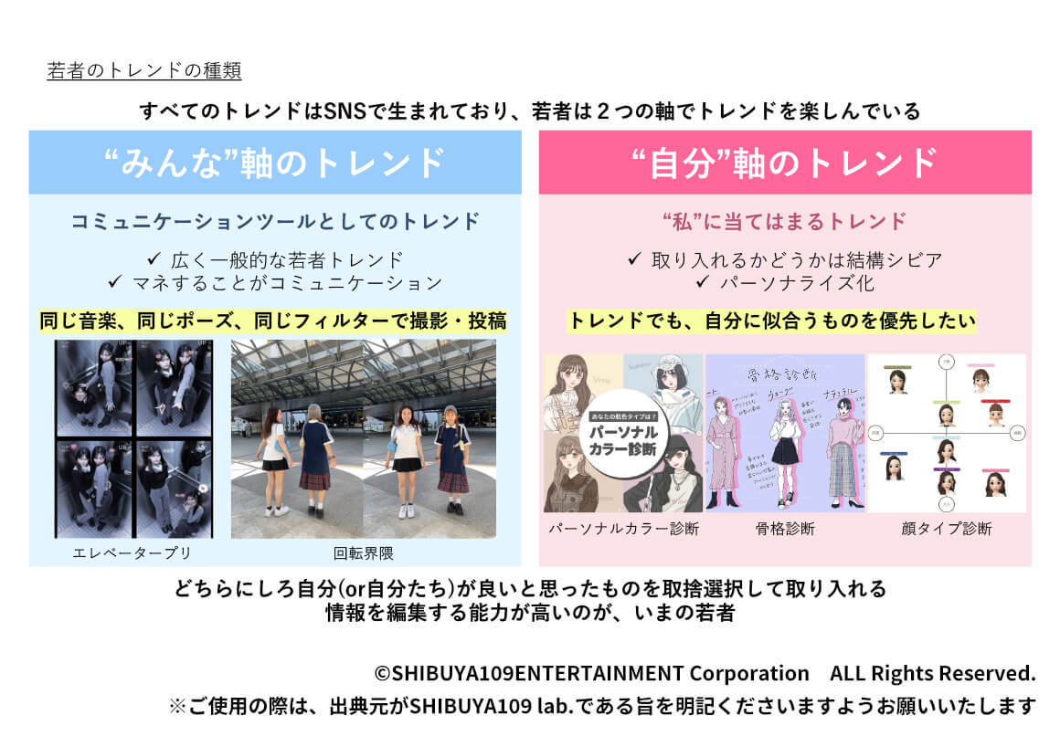 トレンドを追いかけながら、一方で冷静に「それが自分に合ったものなのか」を判断する。現代の若者は、世の中で流行っているトレンドなどといった「みんな軸」と、自分に似合うかどうかといった「自分軸」の2つを常に意識しながら消費していると言えるでしょう。